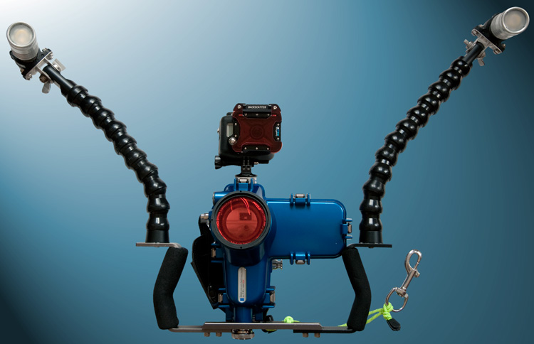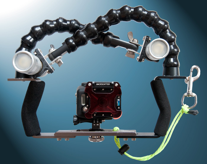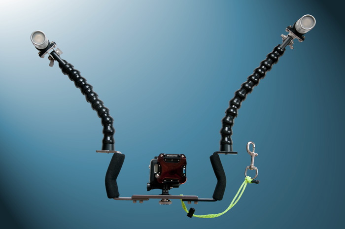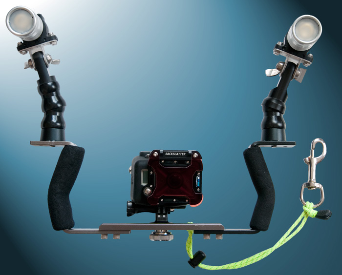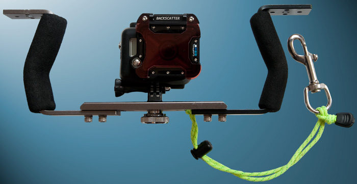 Configuración de doble asa para una mayor estabilidad: Montando la cámara con el adaptador de trípode original GoPro sobre una pletina Fisheye de doble asa se consigue mucha más estabilidad. El conjunto resulta mucho más voluminoso que con el asa Goodman, pero los resultados son muy superiores. http://www.kanau.es/content/view/268/255/ Con el asa y el filtro se pueden conseguir buenos resultados en días claros, con aguas limpias y hasta 15m. de profundidad. Para peores condiciones o mayor profundidad es necesario recurrir a una iluminación de apoyo. |