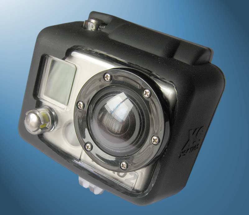 Configuración como cámara POV auxiliar: Montada sobre la zapata de flash de una cámara principal Xacti HD 2000 con carcasa Epoque y la misma iluminación Aqualight PowerLed. Es un equipo para bajar a hacer video, no para filmar mientras se bucea. Aunque de tamaño y peso muy contenidos para lo que se ve por ahí, estamos muy lejos de la transparencia y comodidad de la configuración minimalista. Esto ya no es es espíritu GoPro, aquí utilizamos la GoPro como una cámara gran angular de la que obtener planos con efecto de punto de vista (POV) para intercalar en el video principal que está hecho con la Xacti, con control sobre el enfoque, la exposición, el balance de blancos y el zoom, todo ello cosas de las que carece la GoPro. El modo Protune de la GoPro facilita la integración de su metraje con el de otras cámaras. |